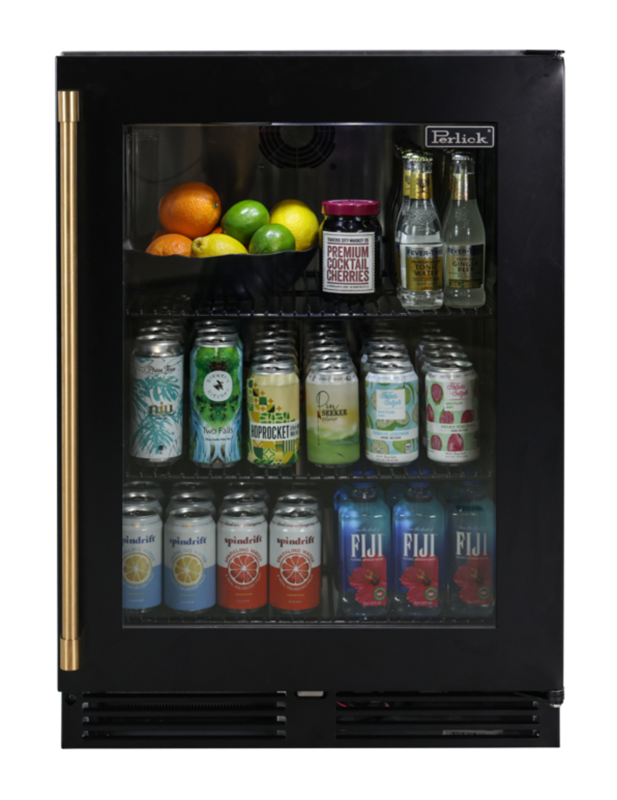 Add a pop of color to any standard height Perlick under counter refrigerator with a painted white or black replacement door accented with brushed brass handles