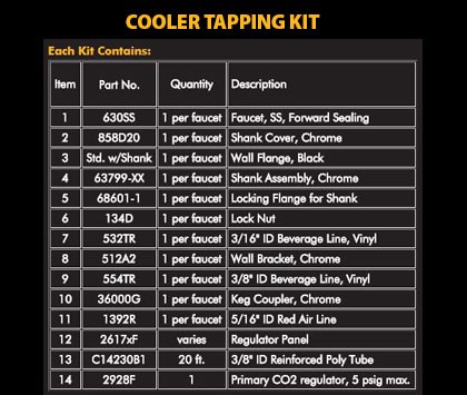 Perlick Cooler Tapping Kits contain all of the components needed to install air-cooled, through-the-wall beverage dispensing. Select a kit based on the cooler wall thickness and the number of faucets needed.