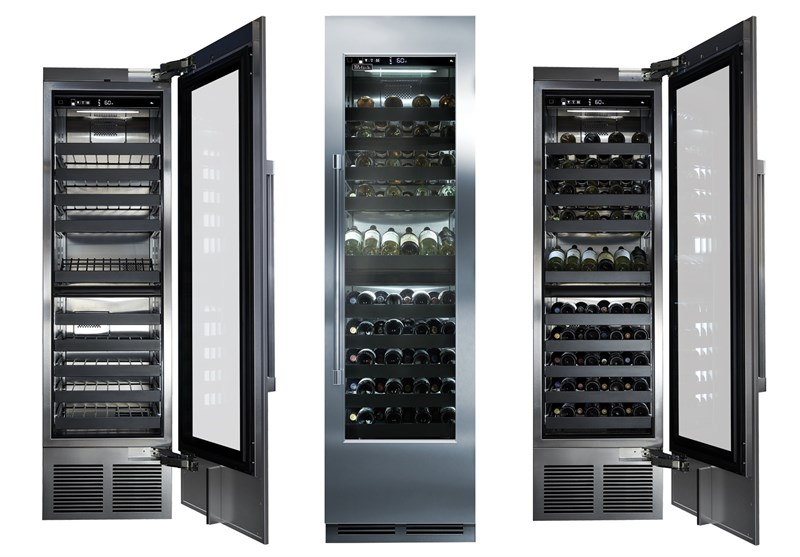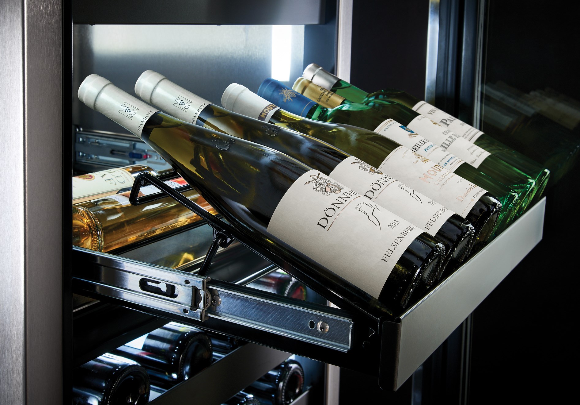 - Heavy-duty, full-extension, soft-closing wine shelves; Shelves are black polymer dipped to provide vibration protection and protect labels from abrasion