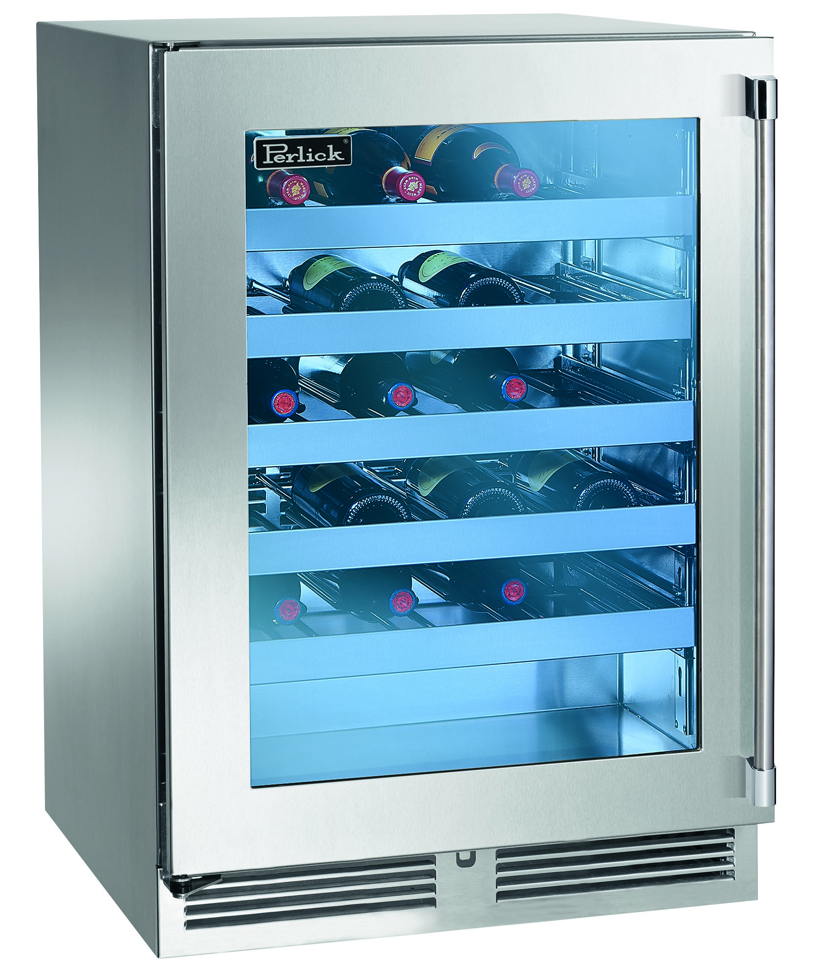 Perlick's 24" Undercounter Wine Reserve features five (5) full-extension vibration free shelves that each hold up to eight (8) 750 ml. wine bottles