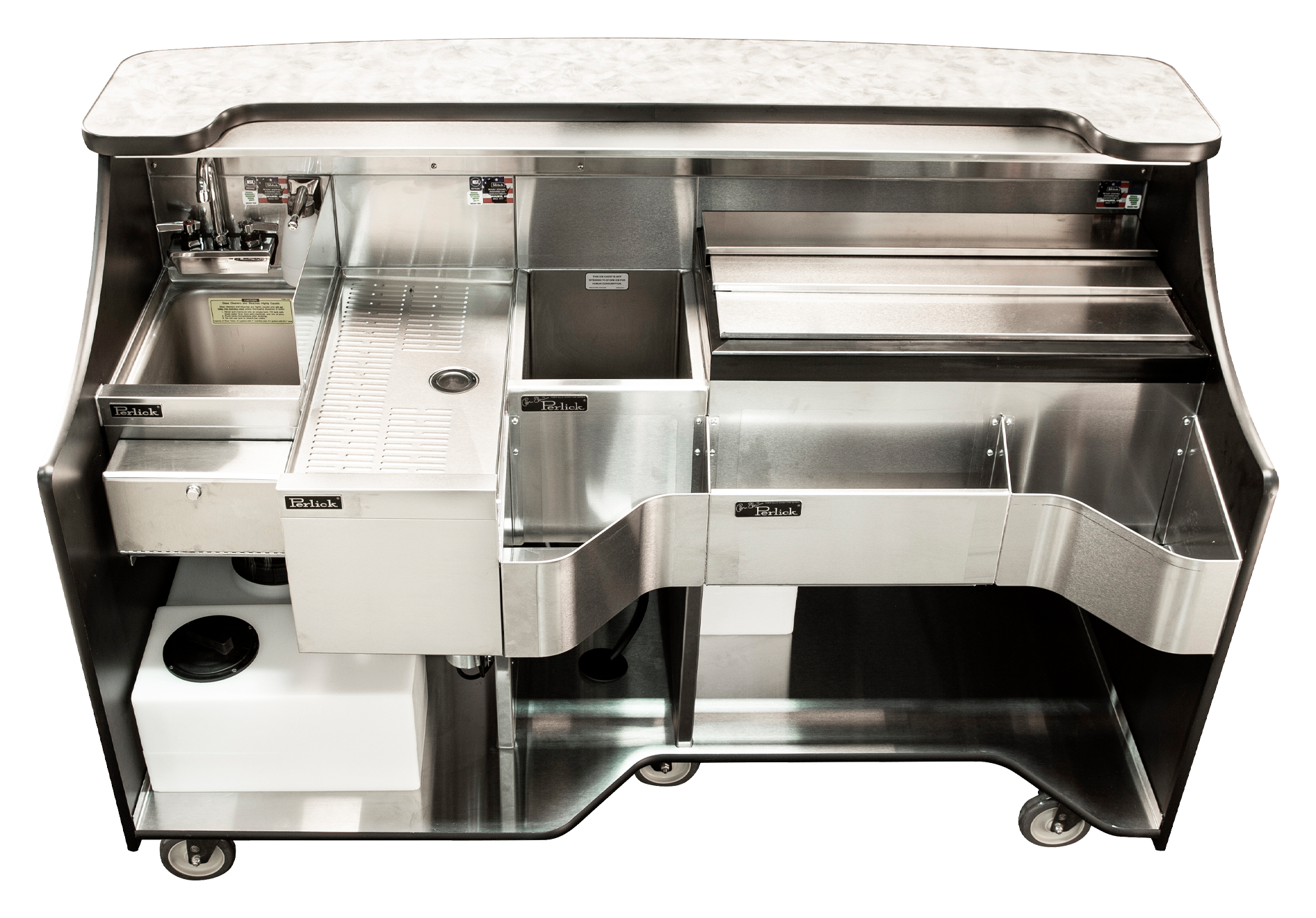 The Perlick Signature Series Mobile Bar designed by Tobin Ellis features the zero-step bartending cockpit design that increases efficiency, maximizes drink throughput, and ensures bartender comfort. The 66" Signature Series Mobile Bar equipment includes drainboard, bottle well, ice chest and hand wash sink.