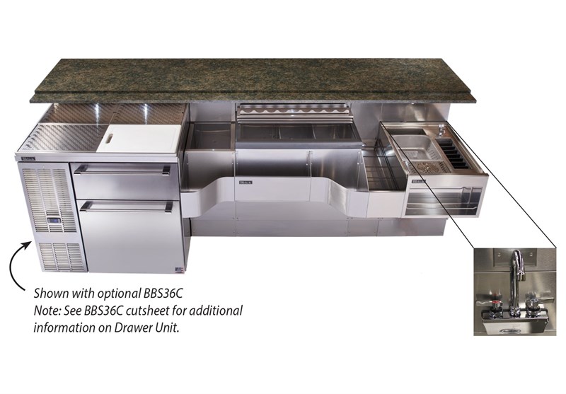 68" Wide, bottle well, ice chest, liquor step, prep sink with wall mount faucet. Featuring the Tobin Ellis zero-step bartending cockpit design that increases efficiency, maximizes drink throughput, and ensures bartender comfort.