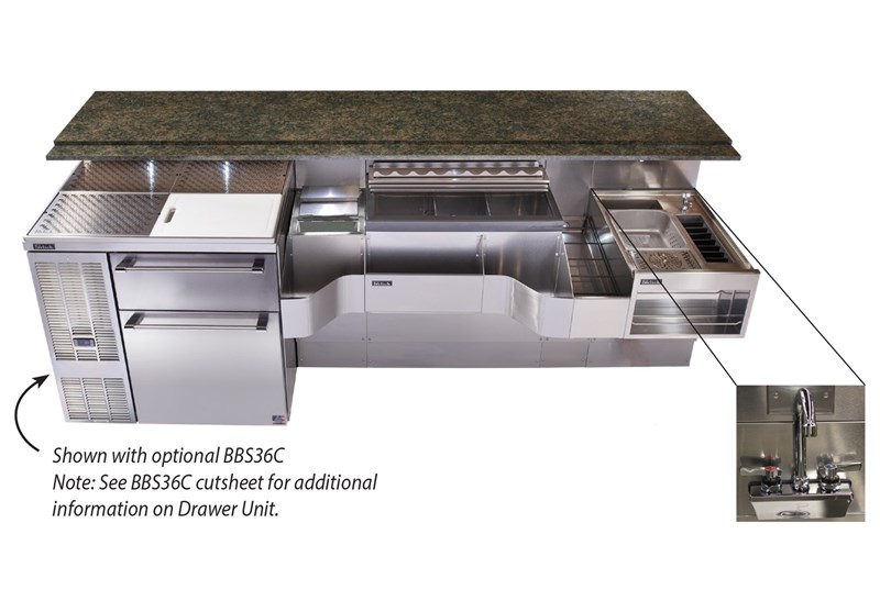 - Prep Sink and Tool Caddy consisting of main sink with integrated glass-rinser, sectional health code compliant tool caddy, foot operated faucet, optional built in cubby for additional storage