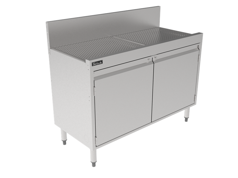 Storage cabinet with pitched drainboard top and adjustable intermediate shelf. Storage Cabinets serve a variety of unique bar environment needs and maximize vertical storage space for all of those items that need to be out of the way but easily accessible.