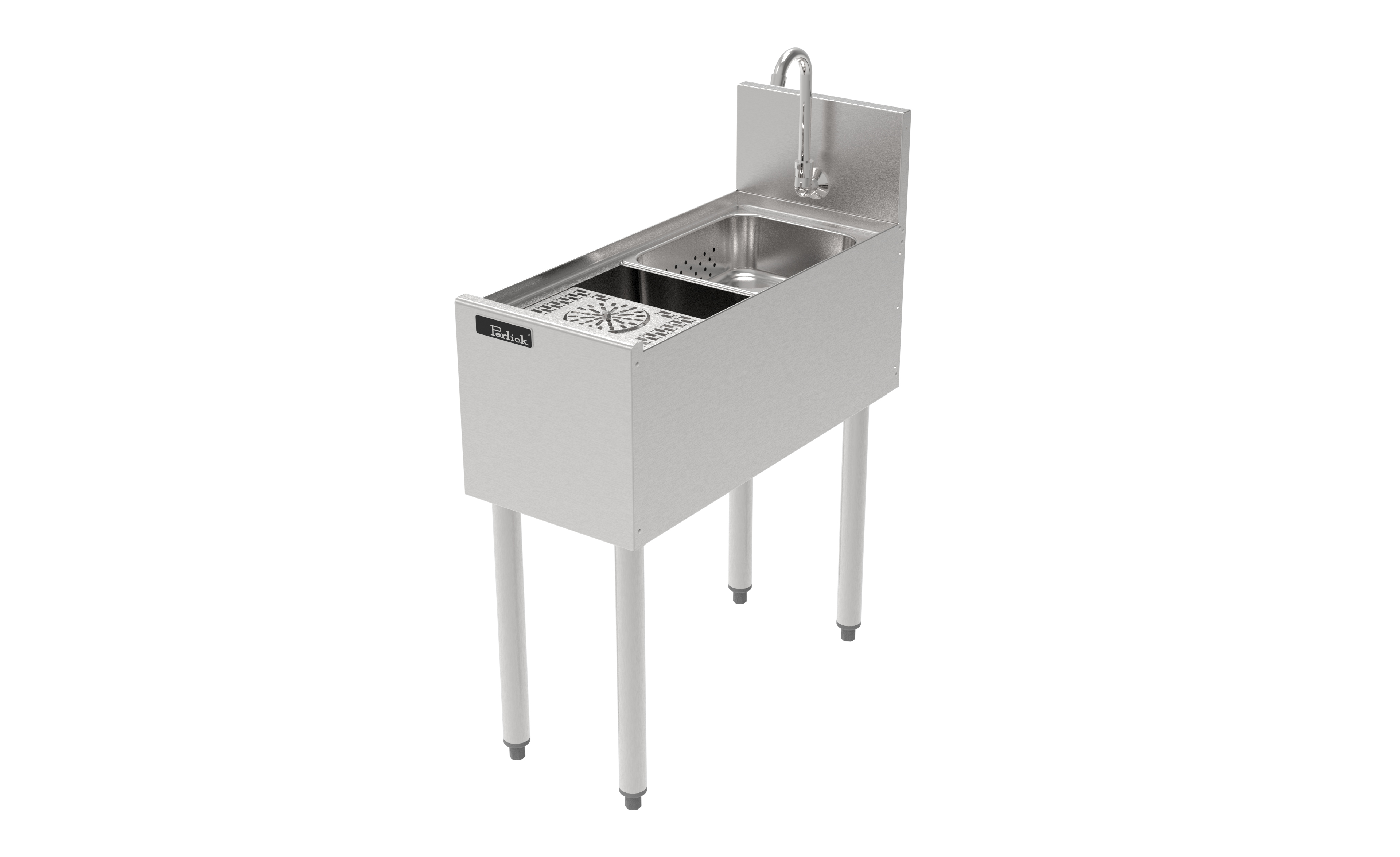 Sink bowl is fabricated in heavy gauge stainless steel with one-piece seamless top. Radius corners provide easy cleaning. An optional built in cubby provides additional useful storage. A sectional, health code compliant tool caddy is available on 18" models.