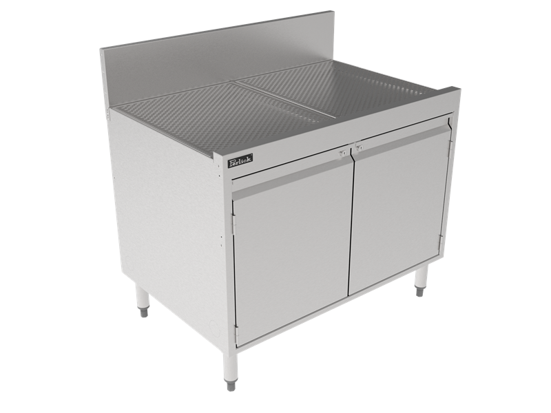 Storage cabinet with pitched drainboard top and adjustable intermediate shelve. Storage Cabinets serve a variety of unique bar environment needs and maximize vertical storage space for all of those items that need to be out of the way but easily accessible.